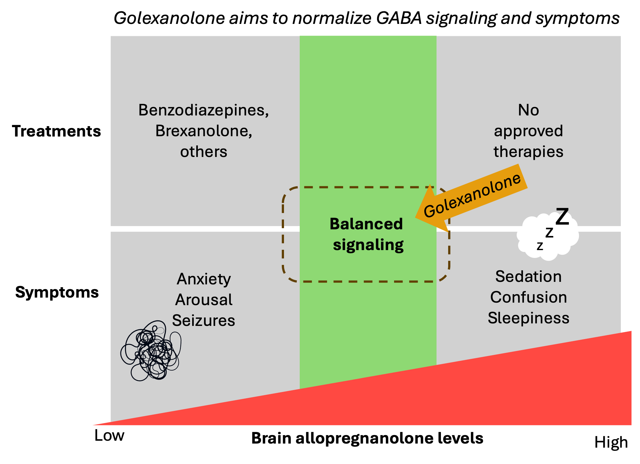 Umecrine Cognition’s research has identified that neuroinflammation raises levels of allopregnanolone, a hormone in the brain that increases GABAA receptor sensitivity, contributing to debilitating symptoms. The company’s lead candidate, golexanolone, is a first-in-class therapy designed to modulate the GABAA receptor in a controlled manner, restoring neural balance and removing neuroinflammation without the risks observed in other treatments.